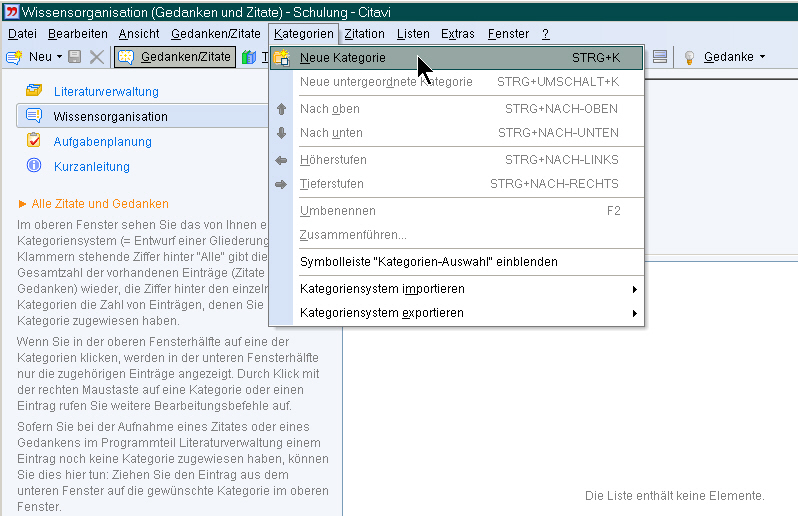 - Den Titelimport lassen wir zunächst unbeachtet. Was nun fehlt, sind Kategorien, die entweder vorab definiert werden können oder bei der Durchsicht der Titel (also sozusagen „on-the-fly“) angelegt werden. Das „globale“ Anlegen der Kategorien erfolgt über den Navigationsmenüpunkt „Wissensorganisation“ (links im Fenster).