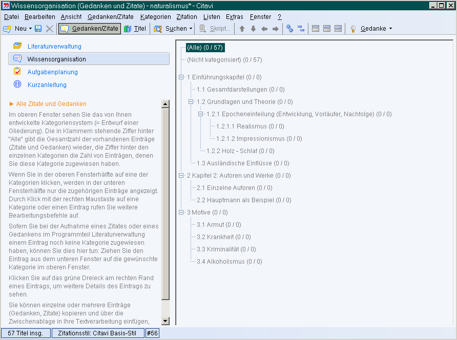 Citavi erlaubt die Organisation, Verwaltung und Verwertung der gesammelten bibliographischen Nachweise über Kategorien und/oder Schlagwörter (=verbale Sacherschließung). Kategorien bieten - gerade in Baumstrukturen - den Vorteil der einfachen Visualisierung von Abhängig- oder Zugehörigkeiten. Jedes „Ding“ wird „verortet“, hat damit „seinen“ Platz. Kategorienbildung und die konsequente Kategorisierung kann helfen, die ungeordneten Literaturnachweise in den Griff zu bekommen, Lücken aufzuspüren, sich einen Überblick zu verschaffen. Kategorien gelten aber nicht zu Unrecht als starr, eindimensional, mitunter einengend. Zwar kann man mit Citavi jeden bibliographischen Nachweis mehreren (gleichrangigen) Kategorien zuordnen, doch geschieht dies vermutlich besser über Schlagwörter (oder „moderner“: Tags). Schlagwörter bilden eher eine inhaltliche Klammer, weniger eine Zuordnung und Verortung in einem Kategorienschema oder -baum. Sie sind von Haus aus mehrdimensional, da einem bibliographischen Nachweis mehrere Schlagwörter zugewiesen werden können, um ihn später über verschiedene Abfragen auf Teilaspekte mit verwandten Literaturnachweisen zusammenzuführen.
